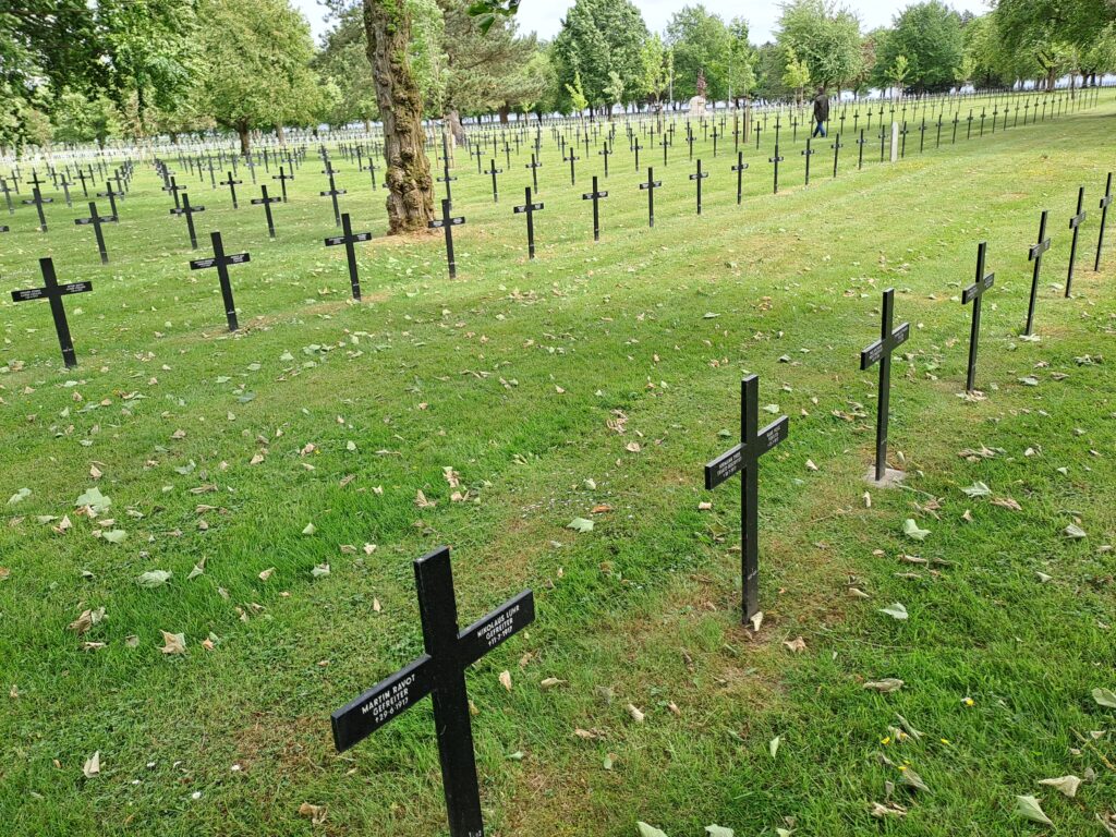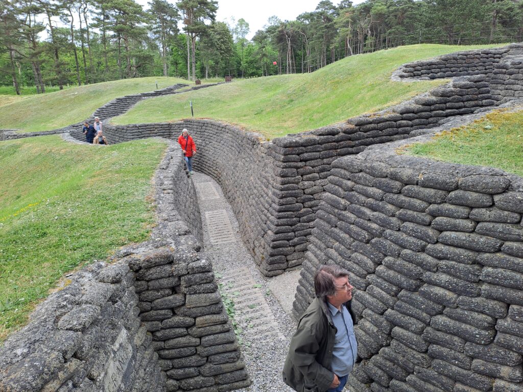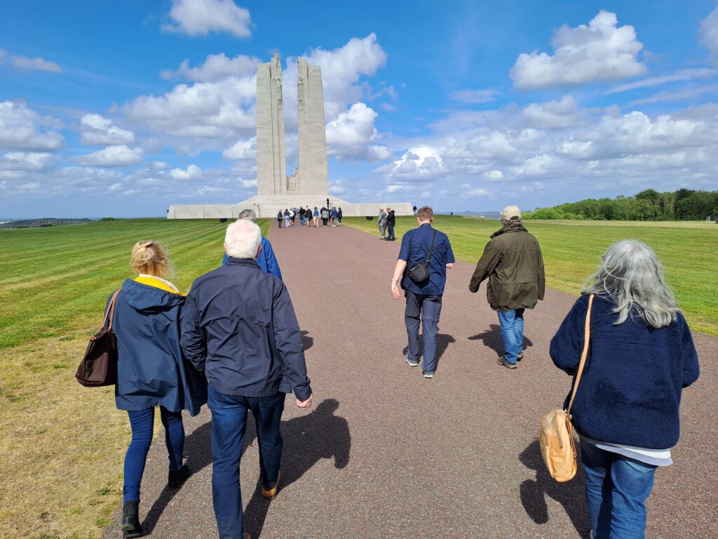 Am Montag, 26. Mai 2025, hieß es auch für die deutsche Gruppe Abschied zu nehmen von den französischen Freunden. Sie fuhr zunächst nach Nordfrankreich, um dort den größten deutschen Soldatenfriedhof aus dem Ersten Weltkrieg in Neuville-St-Vaast mit mehr als 44.000 deutschen Kriegstoten zu besichtigen. Anschließend fuhr die Gruppe einige Kilometer weiter zur kanadischen Gedenkstätte „Mémorial Canadien“ bei Vimy, wo der über 11.000 kanadischen Gefallenen gedacht wird, die im Ersten Weltkrieg gefallen sind. Sehr beeindruckend sind dort die teilweise konservierten Schützengräben und die vielen Bombenkrater.